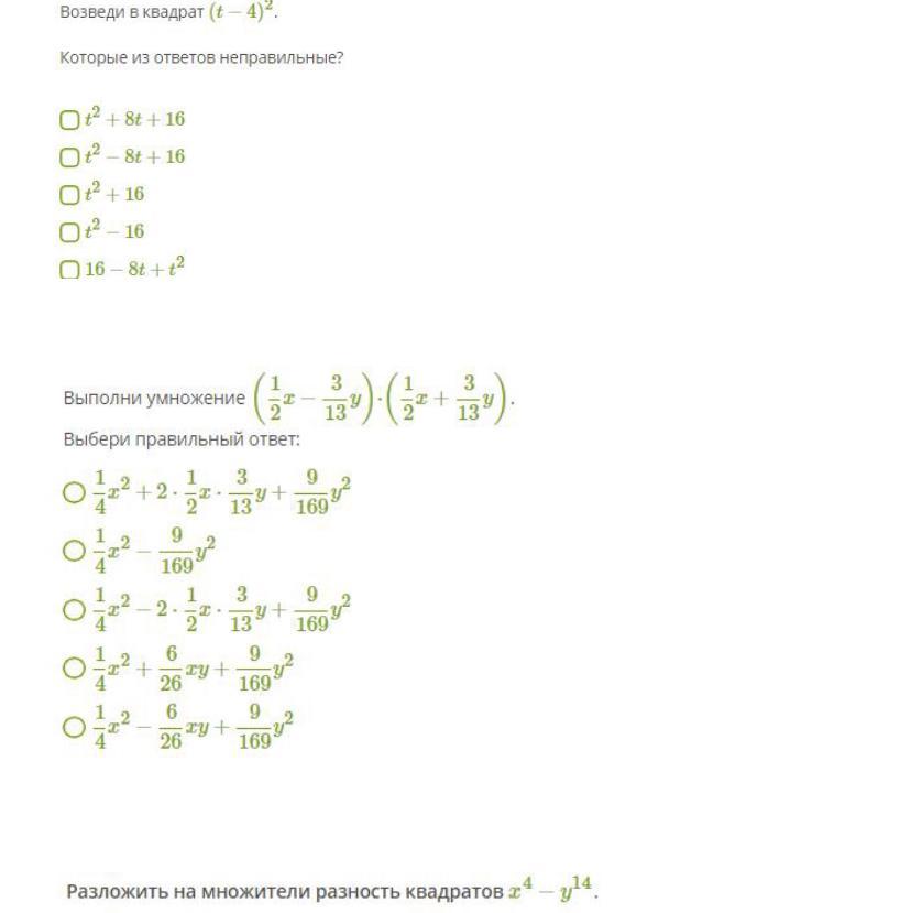 1)Неправильные все,кроме 2 - t^2-8t+16,т.к (t-4)^=(по формуле сокращенного умножения)t^2-2t4+4^2=t2-8t+16