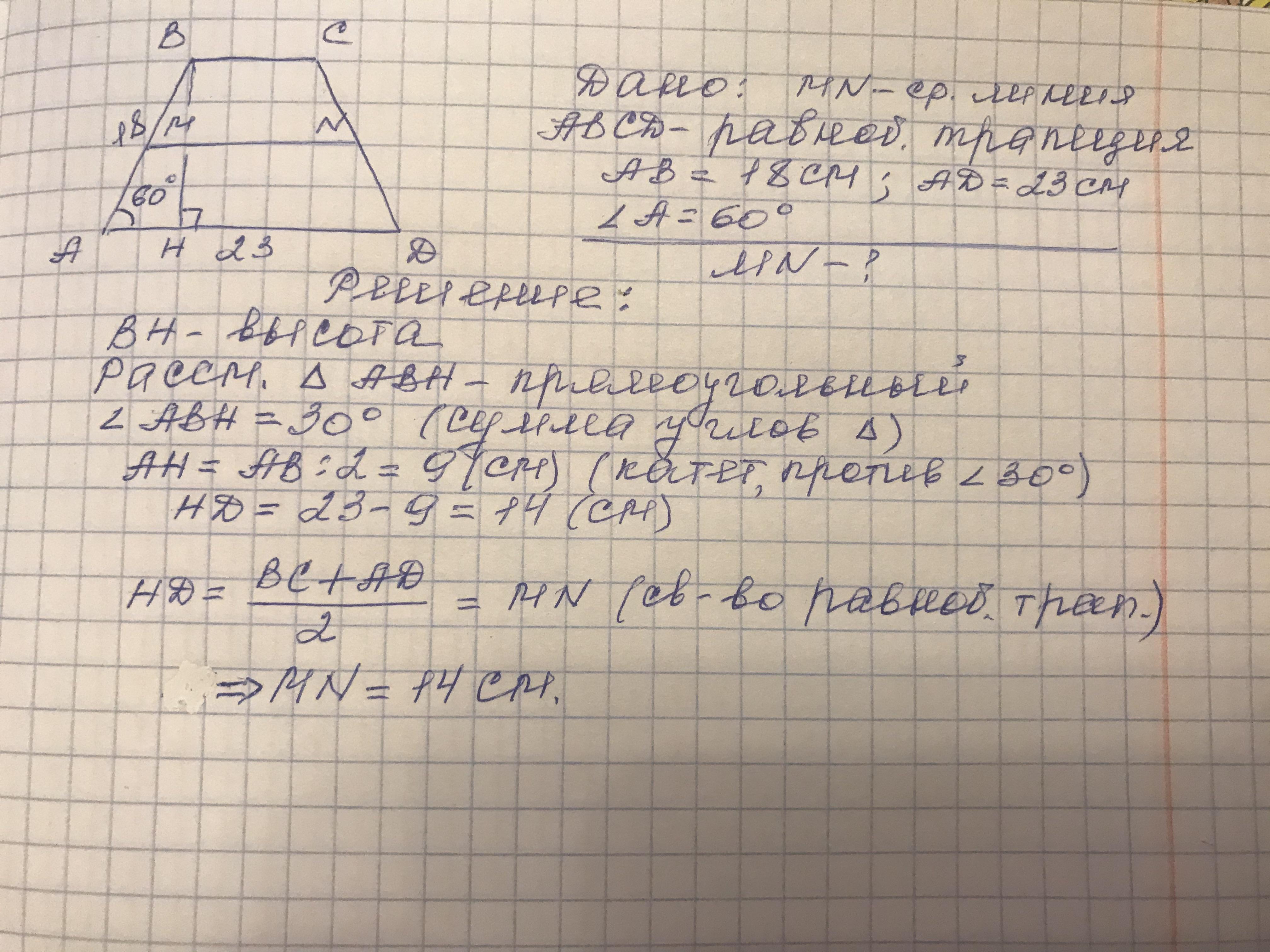 В равнобедренной трапеции один из углов равен 60°,а боковая сторона 18см.Найдите среднюю линию трапеции,если большее основание равно 23 см.