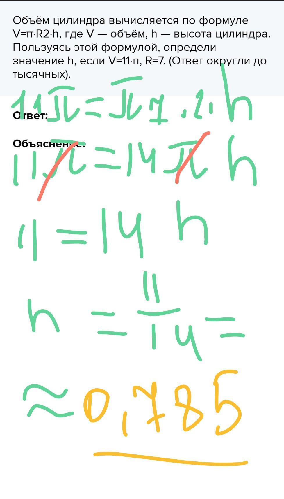 Объём цилиндра вычисляется по формуле V=π⋅R2⋅h, где V — объём, h — высота цилиндра. Пользуясь этой формулой, определи значение h, если V=11⋅π, R=7. (Ответ округли до тысячных).