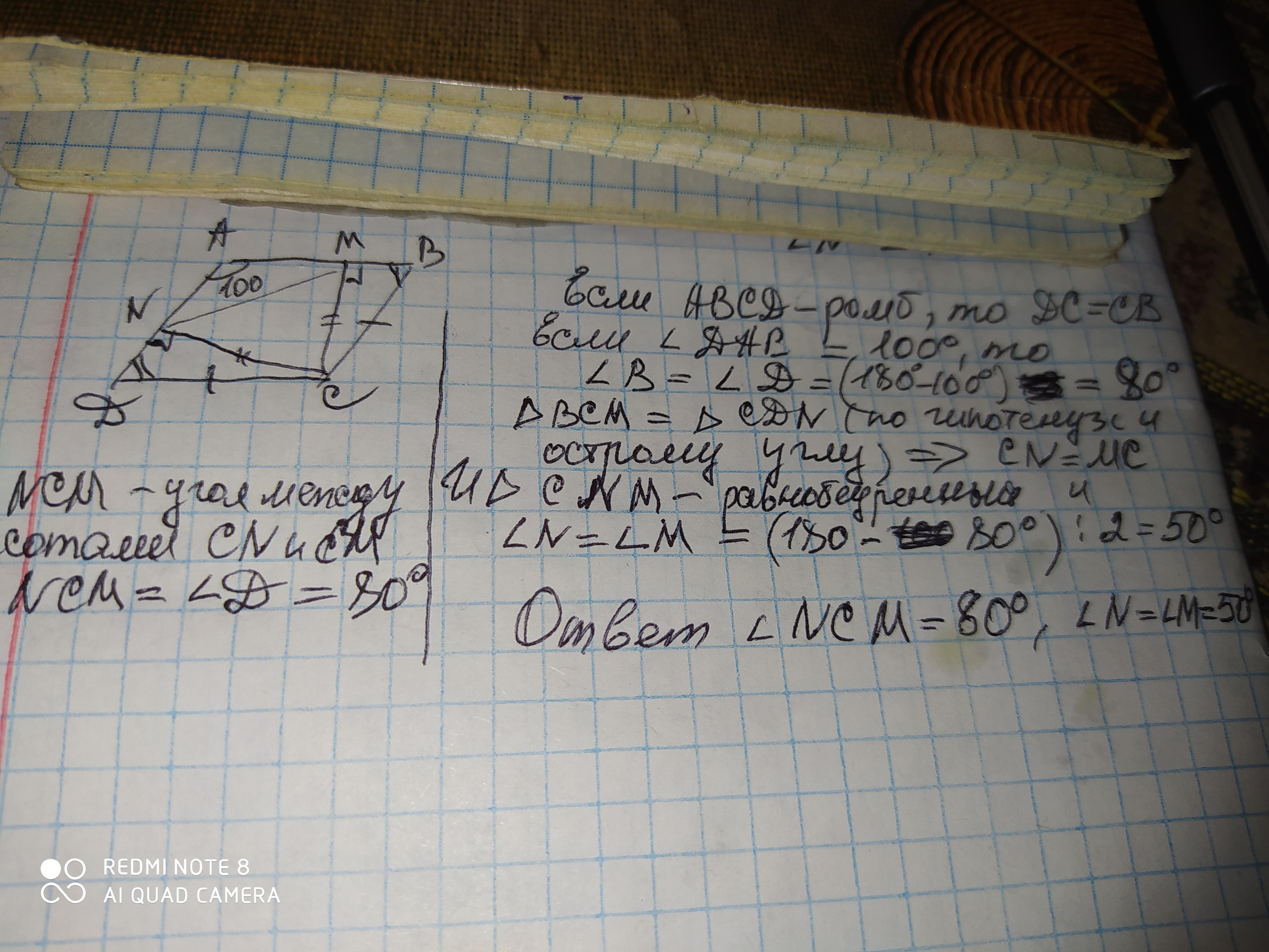 Угол при вершине А ромба ABCD равен 100°. Точки Ми N — основания перпендикуляров, опущенных из вершины C на стороны AB и AD. Найдите углы треугольника CMN.
