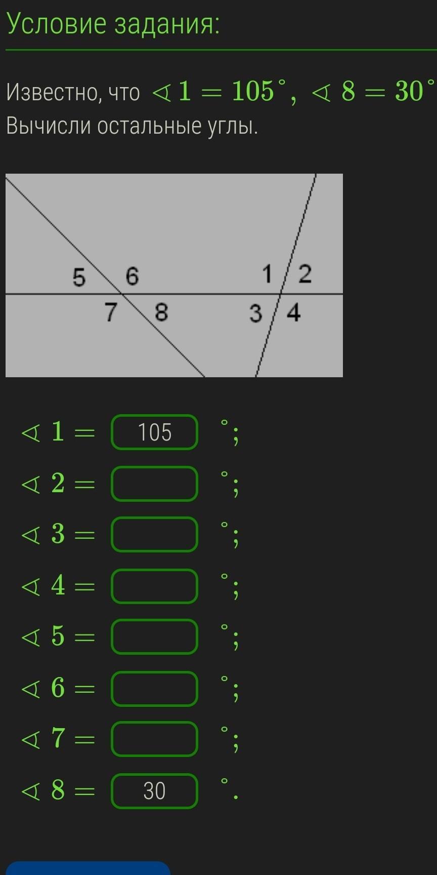 развернутый угол- 180 градусов. Если угол 8 - 30 градусов, то Смежный угол 6 будет 180-30=150 градусов. Угол 7 - является вертикальным углу 6 значит они будут равны. Ну или по проверенной формуле 180-30… угол 5- вертикальный углу 8 значит он тоже будет 30 градусов, ну или после вычисления смежного угла- 180-150=30. По той же технологии вычисляем и другие углы. Если угол 1=105 гр. то смежный будет 180-105= 75 градусов. Соответственно 4=105, 2=75