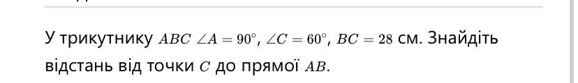 Это расстояние равно длине катета прямоугольного треугольника АС. Катет лежит напротив угла В равного 90-60=30 градусов. Значит он равен половине гипотенузы ВС, т.е. 28:2=14 см