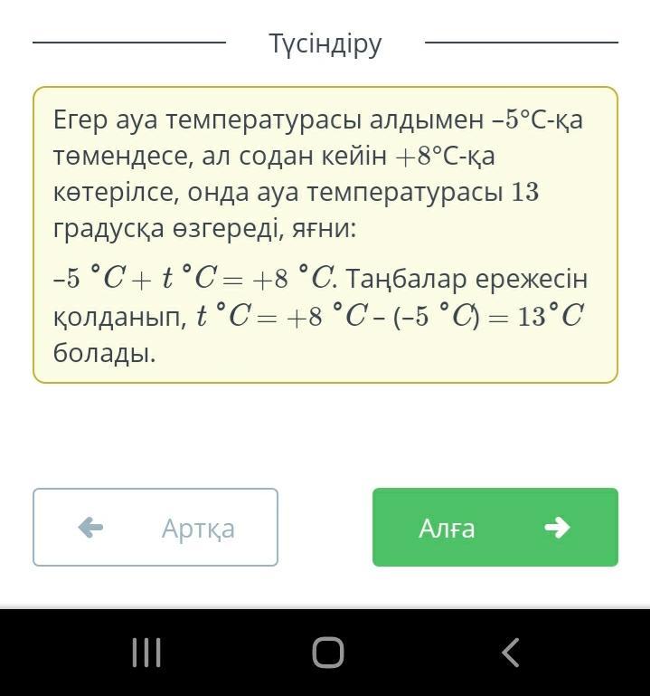 Таңертең ауа температурасы –5°C-қа өзгерді, ал күндіз +8°C-қа дейін көтерілді. Күні бойы ауа температурасы неше градусқа өзгерді?