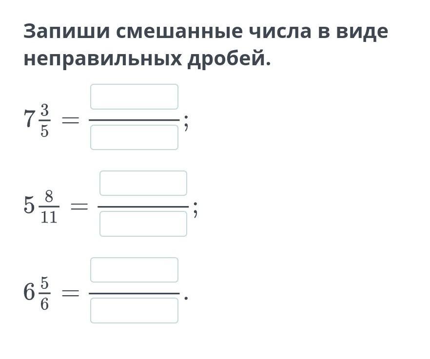 • Чтобы перевести смешанное число в неправильную дробь, надо знаменатель умножить на целую часть и прибавить числитель и эту сумму записать в числителе, а знаменатель оставить прежним.