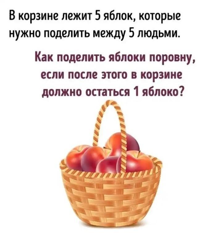 чтобы осталось 1 яблоко нужно ,каждое яблока разделить на восемь частей тогда каждому достанется по яблоку ,и в корзине останется яблоко