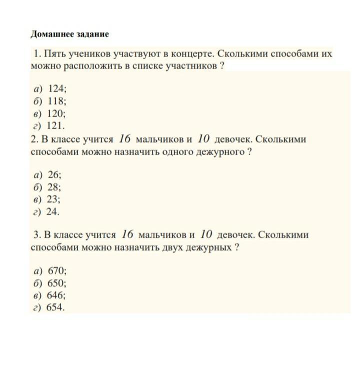 2) Количество учеников в классе = 16+10=26 . Значит 1 дежурного можно выбрать 26 способами .