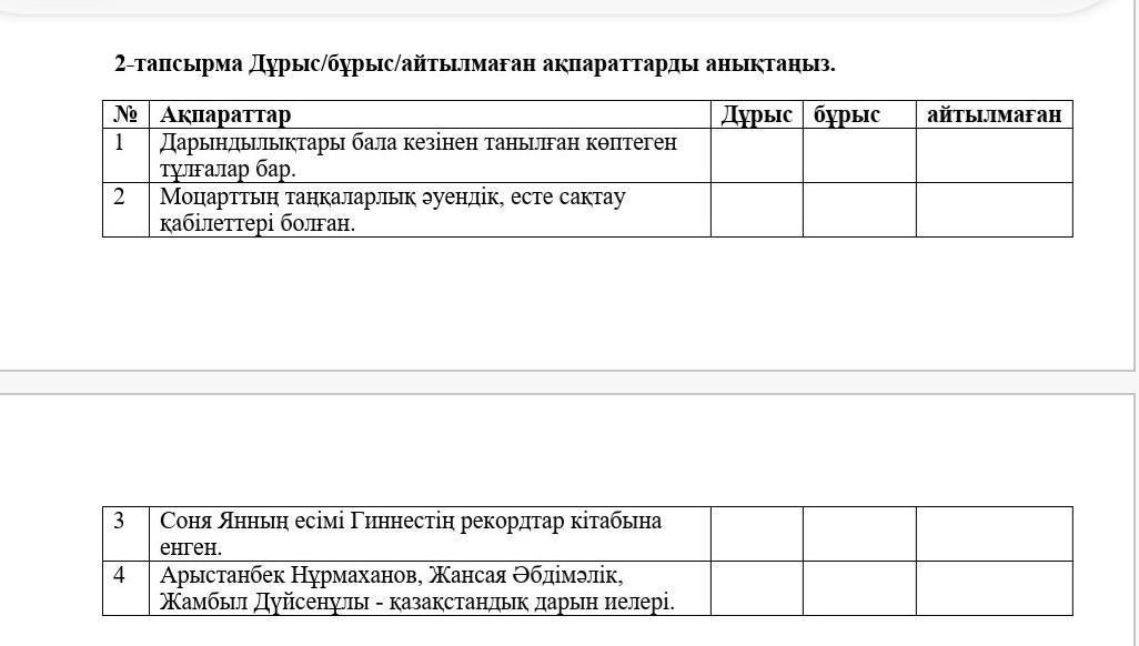 2-тапсырма Дұрыс/бұрыс/айтылмаған ақпараттарды анықтаңыз.