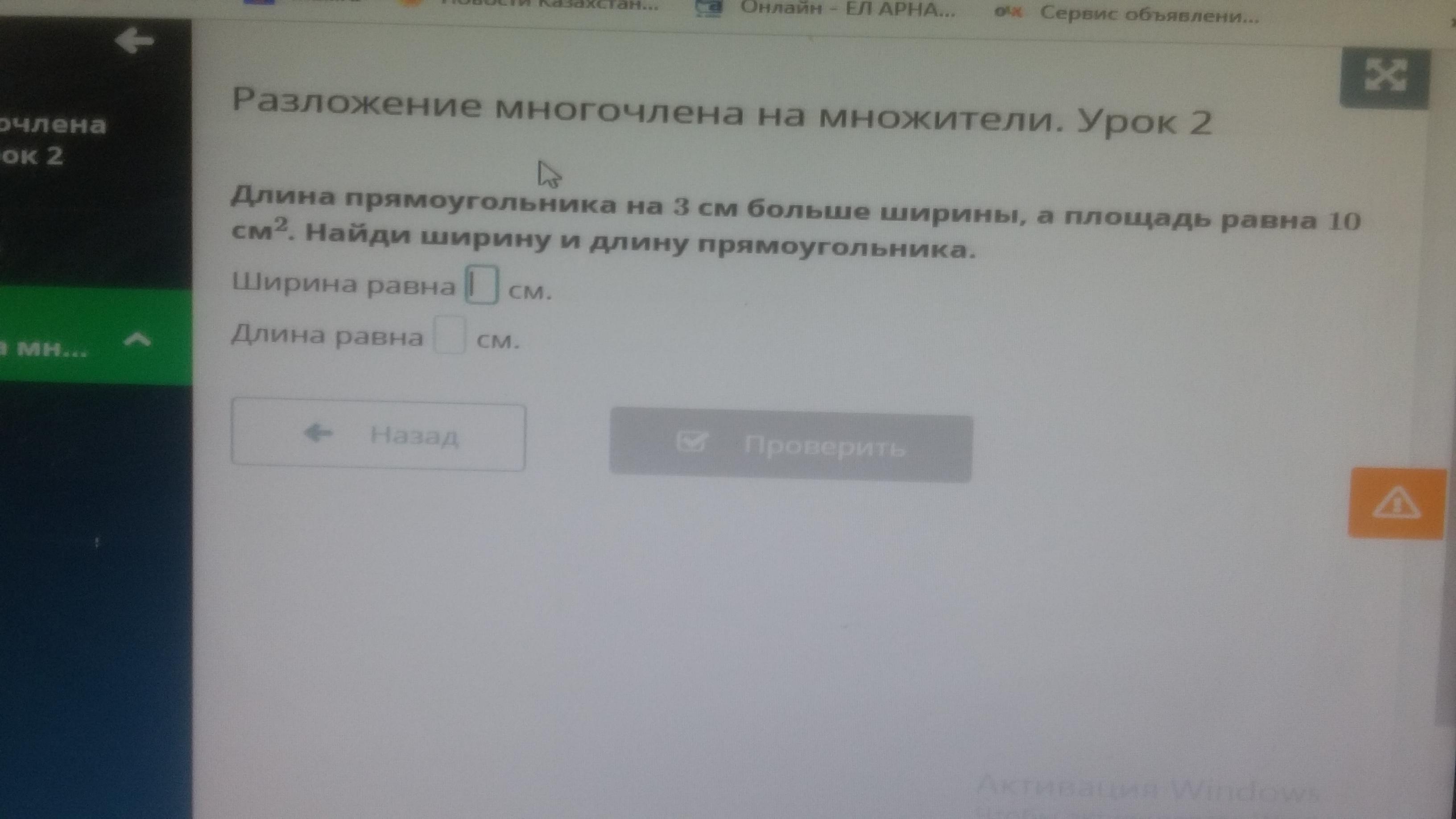 Длинна прямоугольника на 3 см больше ширины а площадь равна 10 см в квадрате .Найди ширину и длину прямоугольника