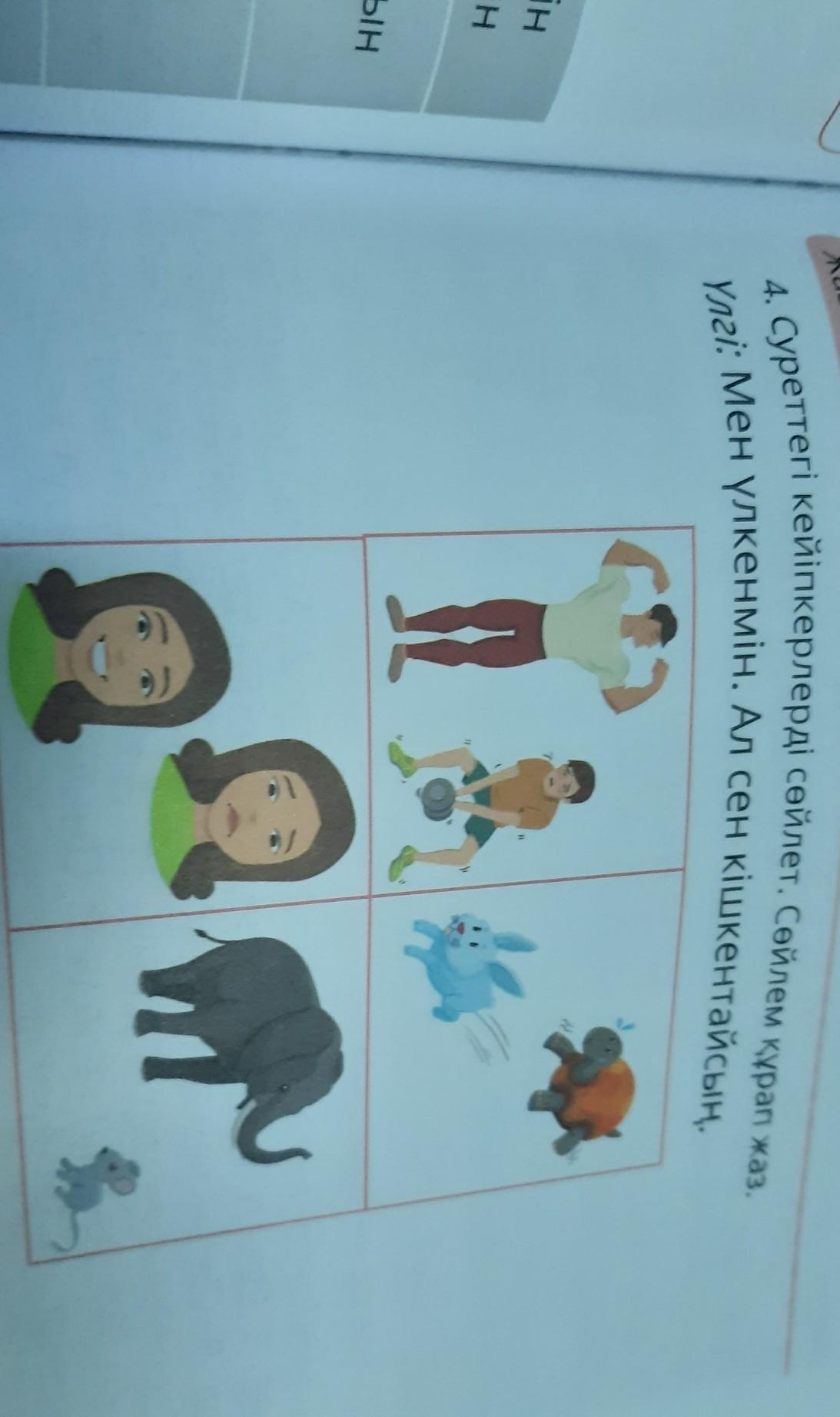 4. Суреттегі кейіпкерлерді сөйлет. Сөйлем құрап жаз.