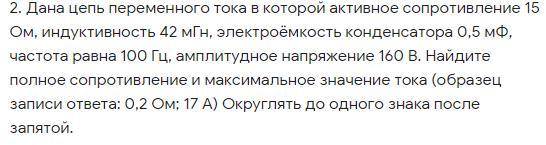 Дана цепь переменного тока в которой активное сопротивление 15 Ом, индуктивность 42 мГн, электроёмкость конденсатора 0,5 мФ, частота равна 100 Гц, амплитудное напряжение 160 В. Найдите полное сопротивление и максимальное значение тока (образец записи ответа: 0,2 Ом; 17 А) Округлять до одного знака после запятой.