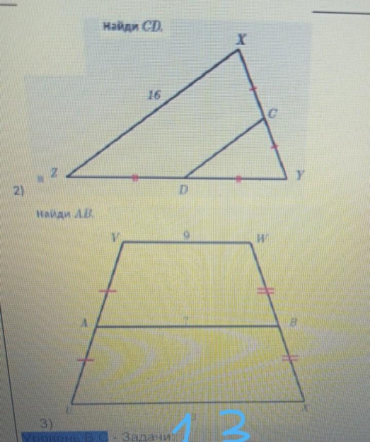 способ 1:средняя линия треугольника СД = 1/2 YZ, если во время экзамена вдруг не помните теорему Фаллеса , то можно