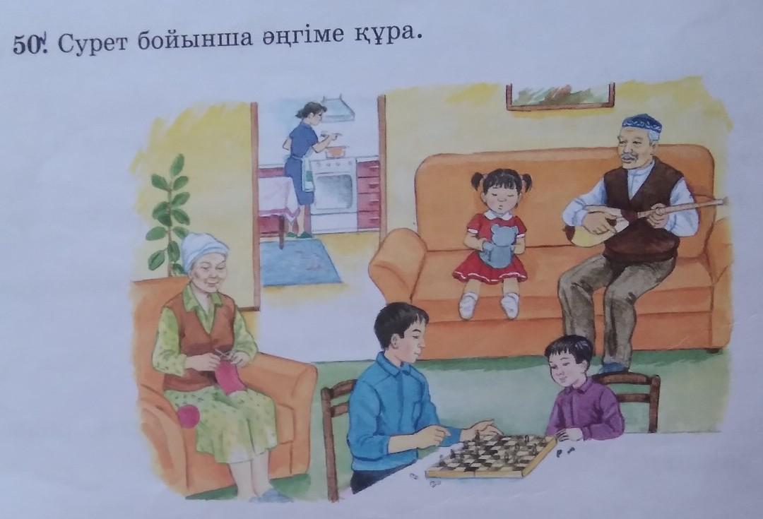 Дедушка играет на добре. Девочка читает книгу. Брат и братишка играют в шахматы. Бабушка плетёт. Мама моет посуду