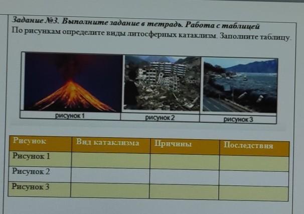 Ответ:1 извержение, переизбыток магмы под землёй, образование обсидиана 2, землетрясение, образование гор или вулканов, сломанные инфраструктуры, 3, цунами, подводные землетрясения, разрушенные инфраструктуры.