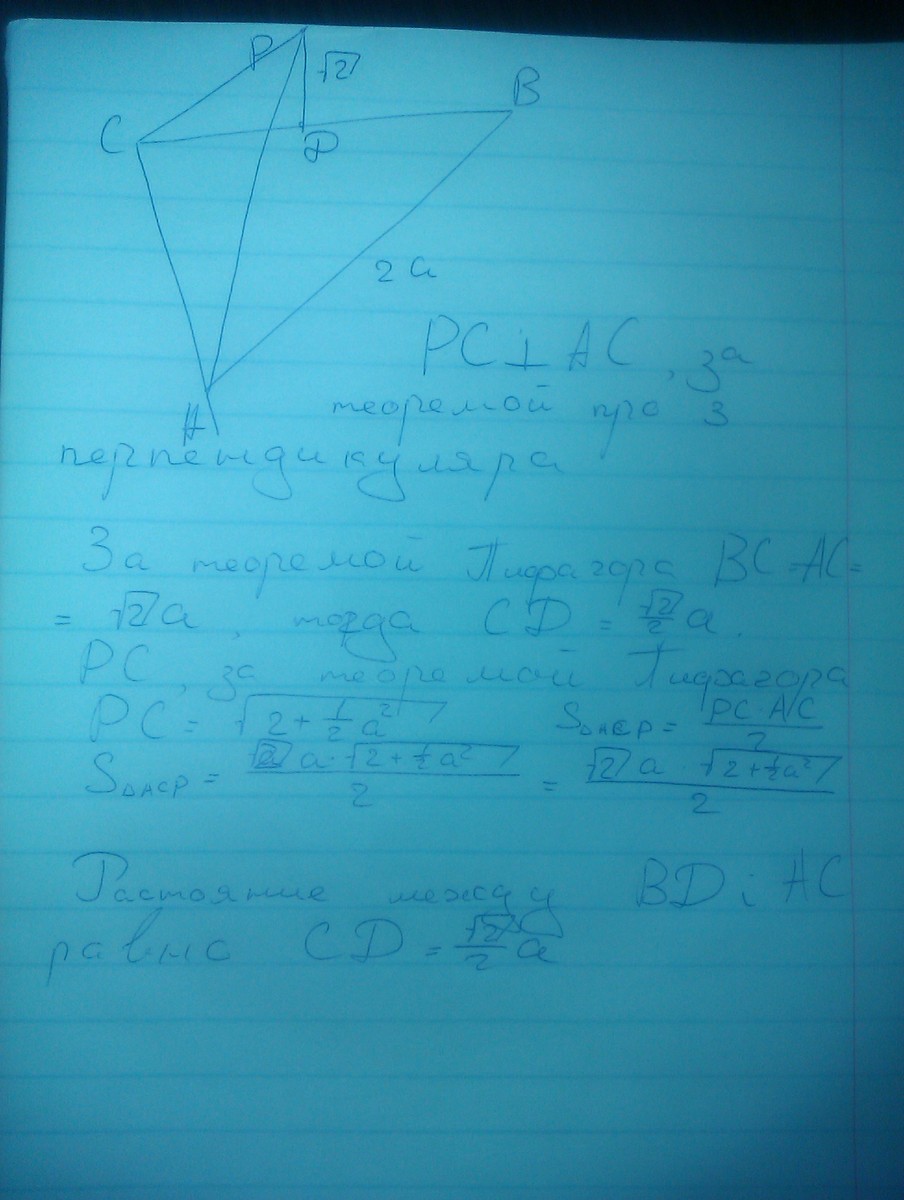 срочно нужно помогите пожалуйста кто уверен в решение!!!! Через середину Д катета ВС равнобедренного прямоугольного треугольника АВС угол С=90 градусов ,проведем к его плоскости перпедникуляр РД равен а корень из 2.Гипотенуза треугольника равна 2а.Найдите а) площадь треугольника РСА, б)расстояние между прямыми ВД и АС.