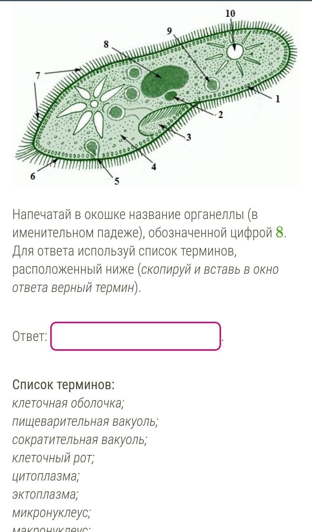 Напечатай в окошке название органеллы (в именительном падеже), обозначенной цифрой 8. Для ответа используй список терминов, расположенный ниже (скопируй и вставь в окно ответа верный термин).