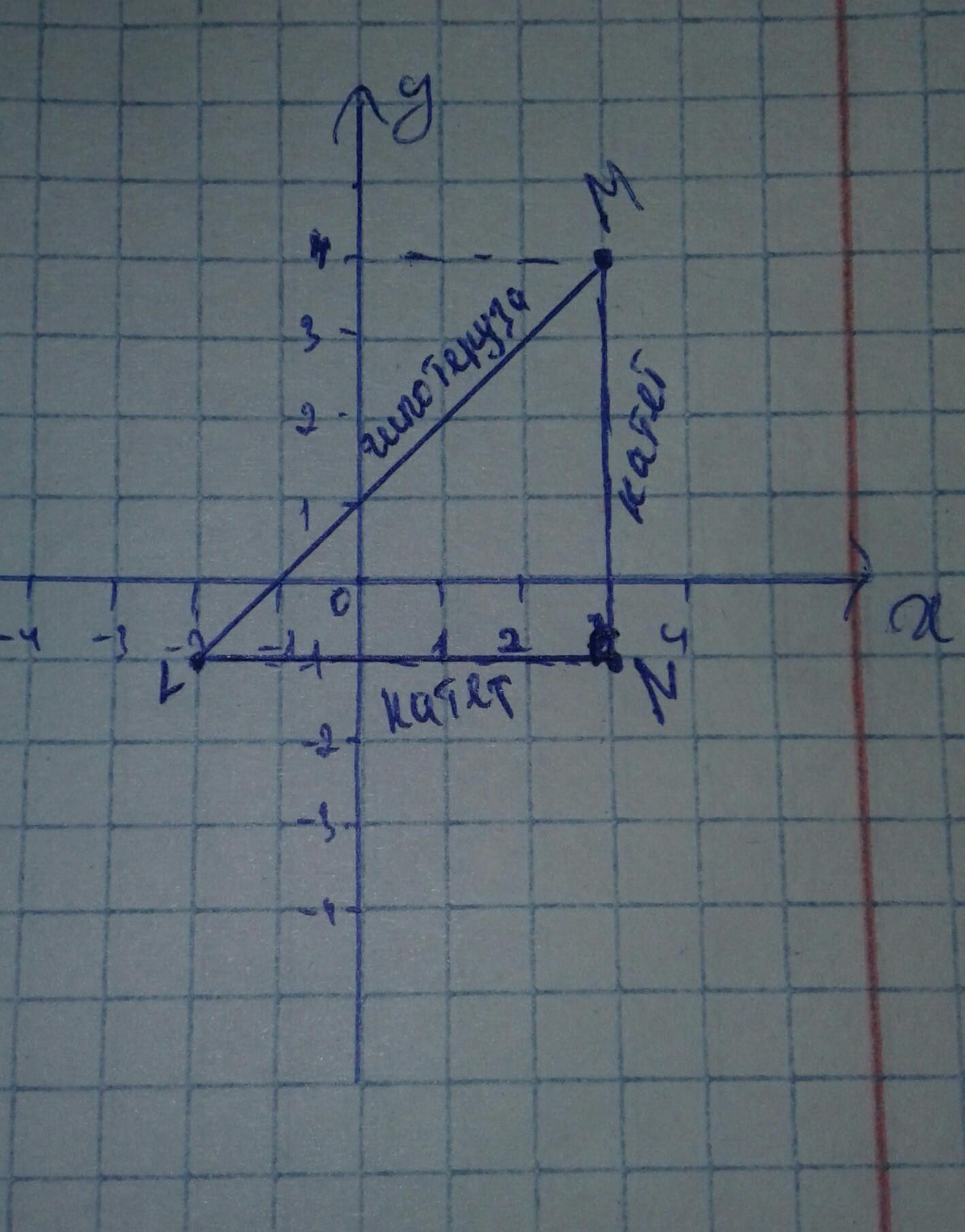 74. Начертите прямоугольный треугольник, вершины которого распо- ложены в точках L(-2; - 1), M(3; 4), N(3; - 1), вычислите его площадь, назовите его катеты и гипотенузу.