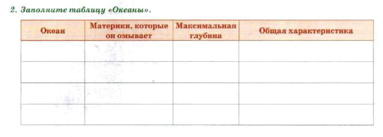 Например: 1. Тихий океан. 2. В Евразии, Северной Америке, Южной Америке, Австралии и Антарктиде. 3.10994м. 4. 53% от общего объема воды составляет вода.