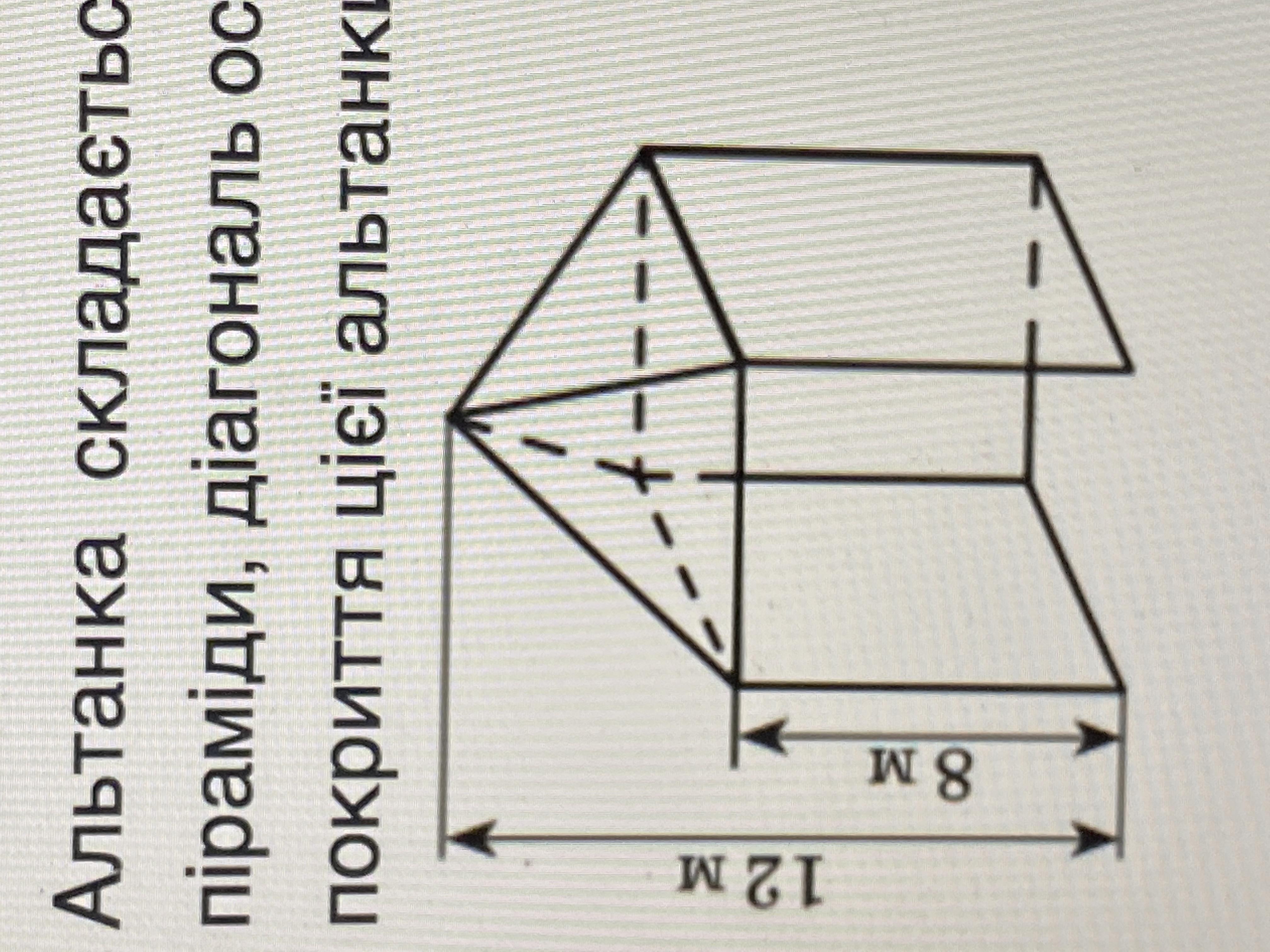 Альтанка складається їх трьох бічних граней прямокутного паралелепіпеда та поавильної чотирикутрої піраміди, діагональ основи якої дорівнює 6√2 м. Визначте, скільки квадратних метрів тканини необхідно покриття цієї альтанки