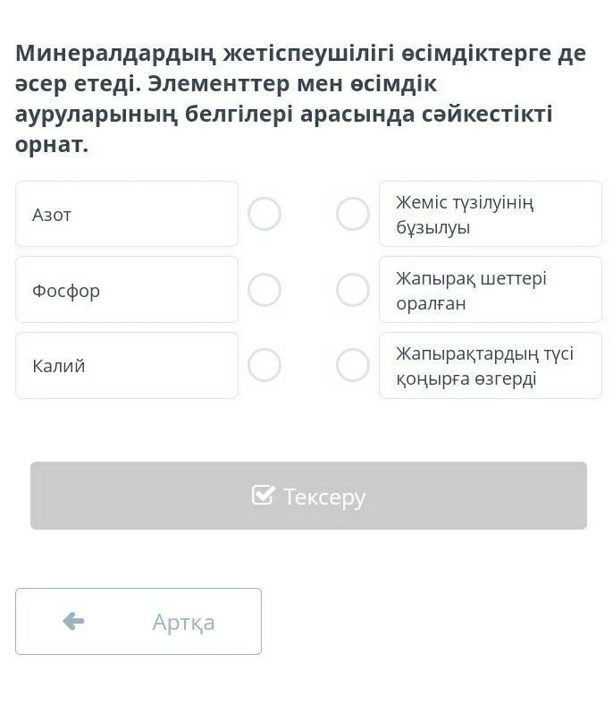 Минералдардың жетіспеушілігі өсімдіктерге де әсер етеді. Элементтер мен өсімдік ауруларының белгілері арасында сәйкестікті орнат.