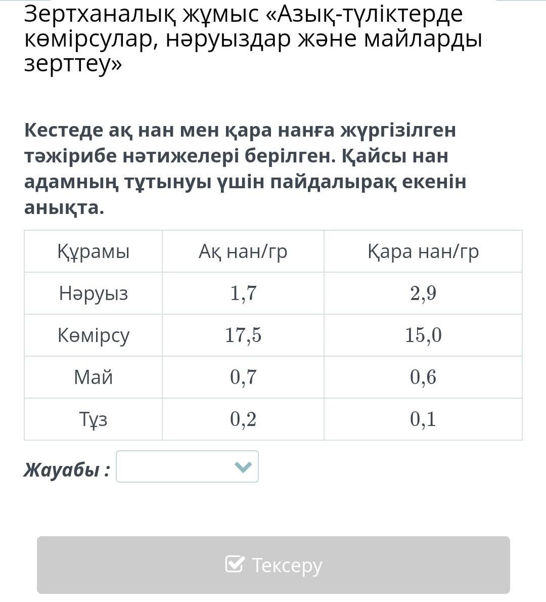 Кестеде ақ нан мен қара нанға жүргізілген тәжірибе нәтижелері берілген. Қайсы нан адамның тұтынуы үшін пайдалырақ екенін анықта.
