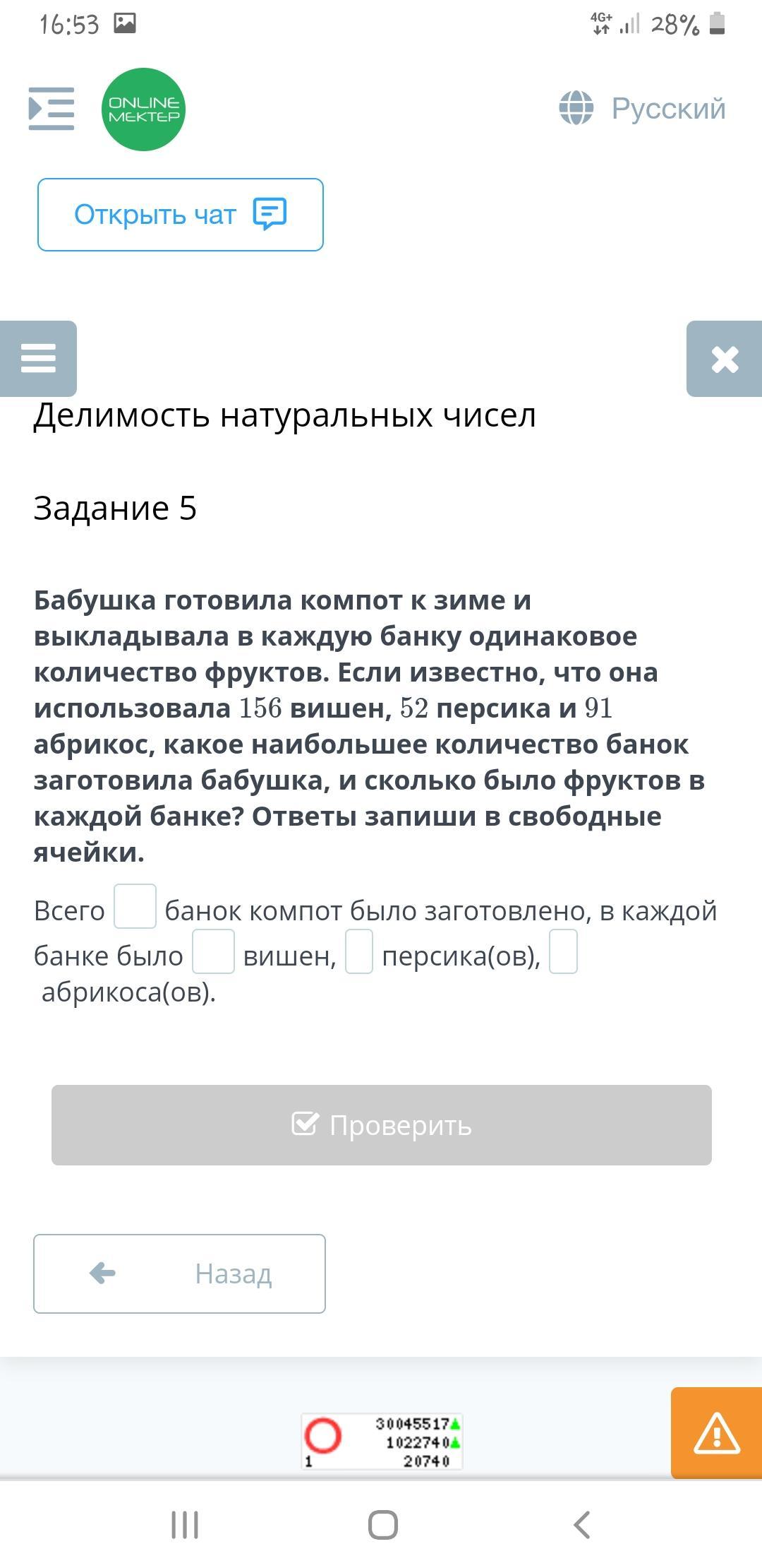 Бабушка готовила компот к зиме и выкладывала в каждую банку одинаковое количество фруктов. Если известно, что она использовала 156 вишен, 52 персика и 91 абрикос, какое наибольшее количество банок заготовила бабушка, и сколько было фруктов в каждой банке? Ответы запиши в свободные ячейки.