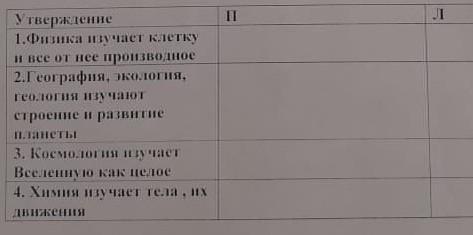Определите истинность ложность утверждений видов наук Заполните таблицу знаками и "п" правда или "л"ложь физика изучает клетку и всё от неё произведённые