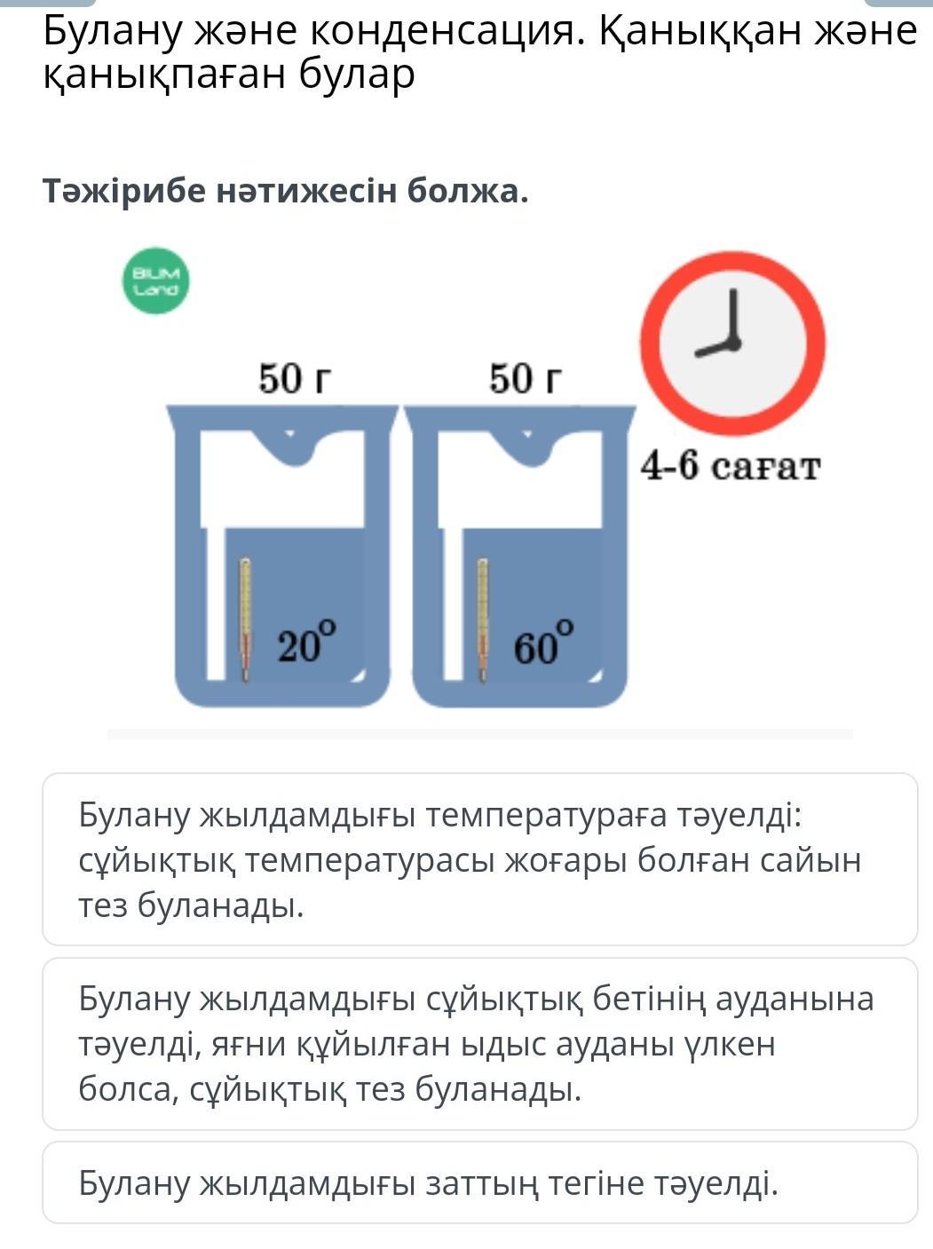 Ответ:Булану жылдамдығы температураға тәуелді: сұйықтық температурасы жоғары болған сайын тез буланады.