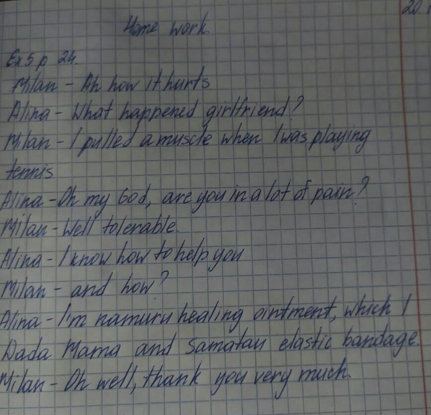 -Hello. -Hi what are you going? -I am reading the book "Sherlok Holmes" -I see, what is she talking about? -About Detective Sherlok Holmes anb his assistant Dr. Watson -Who wrote this book -Conan Doyle, in one of his books,Holmes dies, but by popular demand he resurrected him -It is interesting, but I recently finished reading the book "Robinson Crusoe" -Well, how did you like it? -Wonderful book, did not regret reading -Will you read it later? -Okay, and you me yours