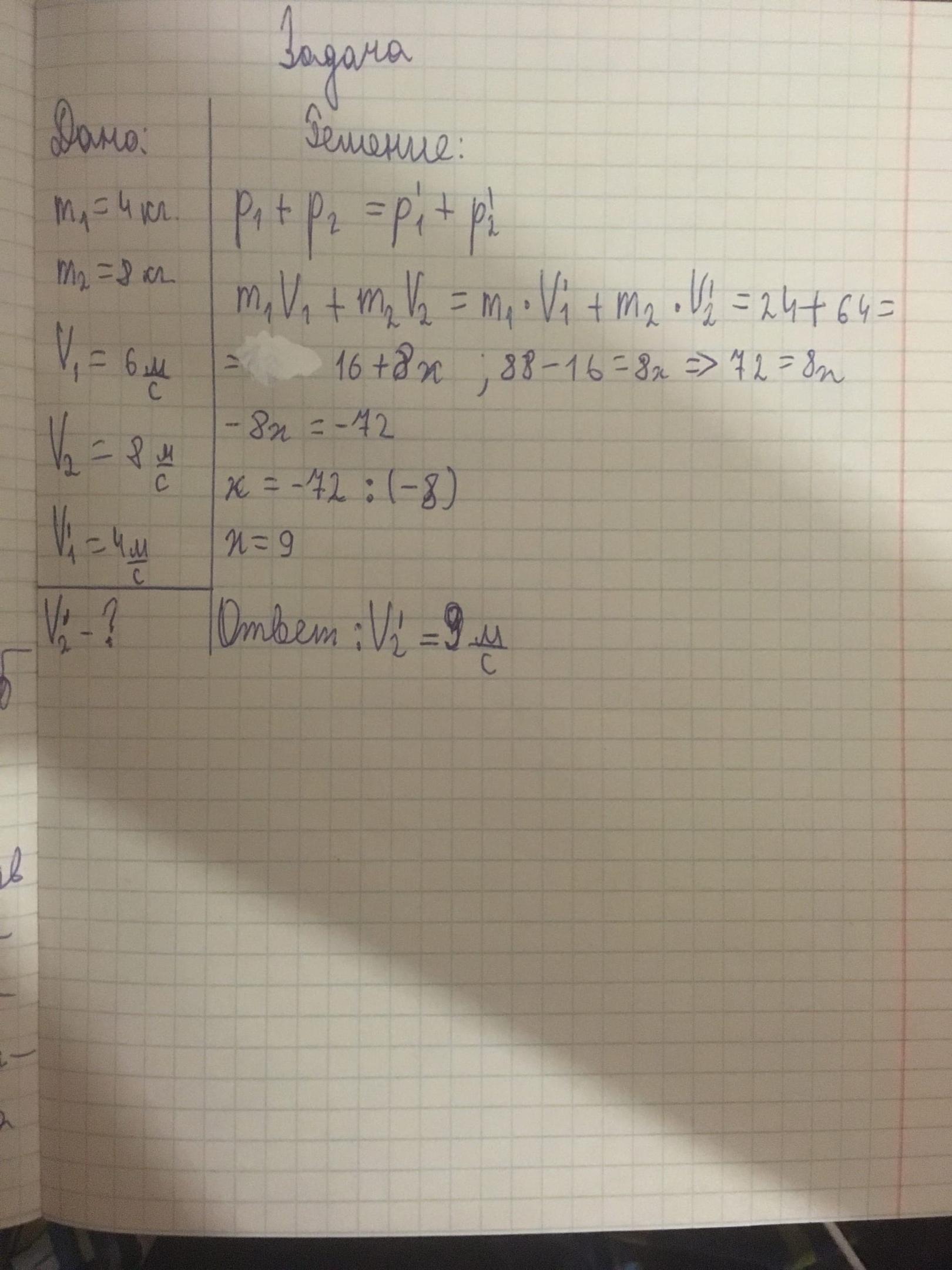 Найти скорость тела после взаимодействия, если взаимодействуют два тела массами 4 и 8 кг, скорость первого тела 6 м/с, скорость второго 8 м/с. Скорость 1 тела после взаимодействия стала 4 м/с