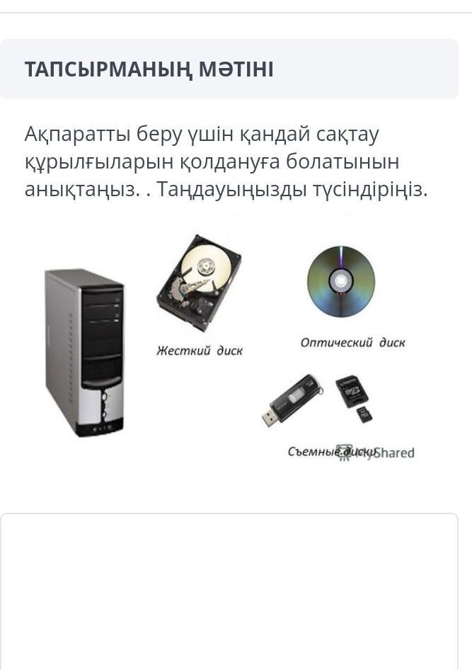 Ақпаратты беру үшін қандай сақтау құрылғыларын қолдануға болатынын анықтаңыз. Тандауынызды түсіндірініз. Срочно керек