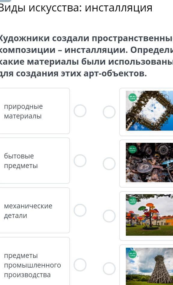 Художники создали пространственные композиции – инсталляции. Определи, какие материалы были использованы для создания этих арт-объектов.