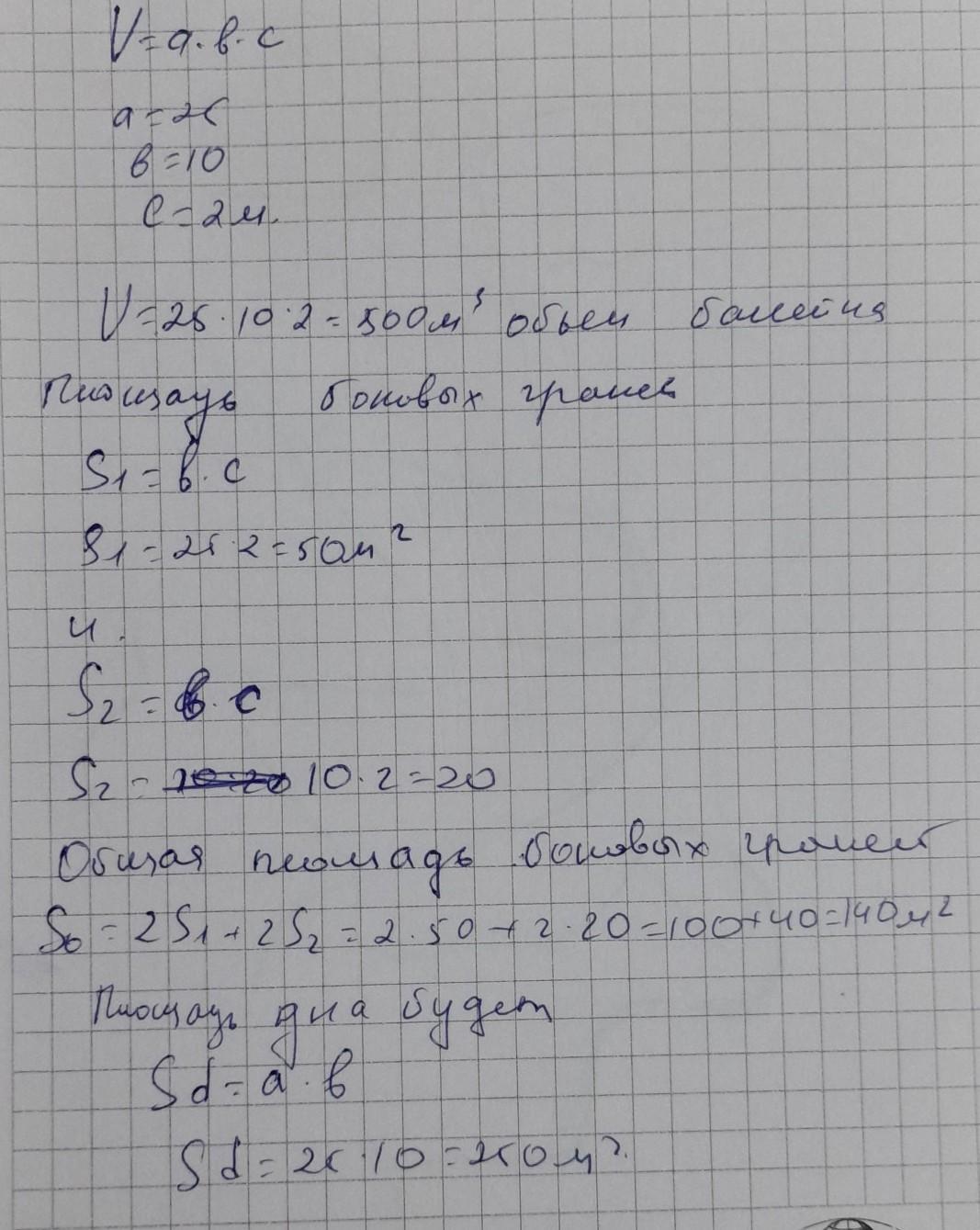 А)Узнай объём бассейна,если его длинна - 25м, ширина 10м глубина 2м.найди площадь боковых граней и дна бассейна