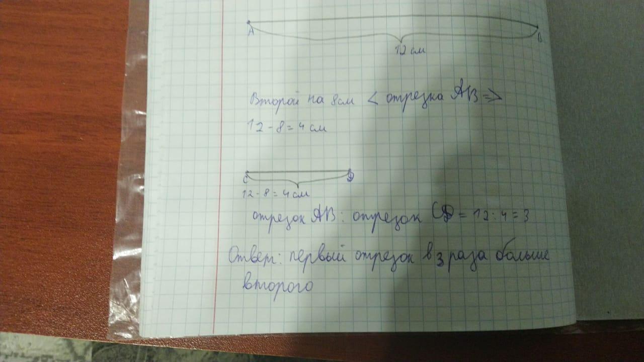 Начерти два отрезка один длиной 12 см а другой на 8 см короче Во сколько раз длина второй отрезок меньше Длина первого
