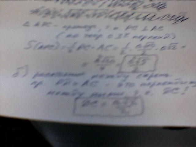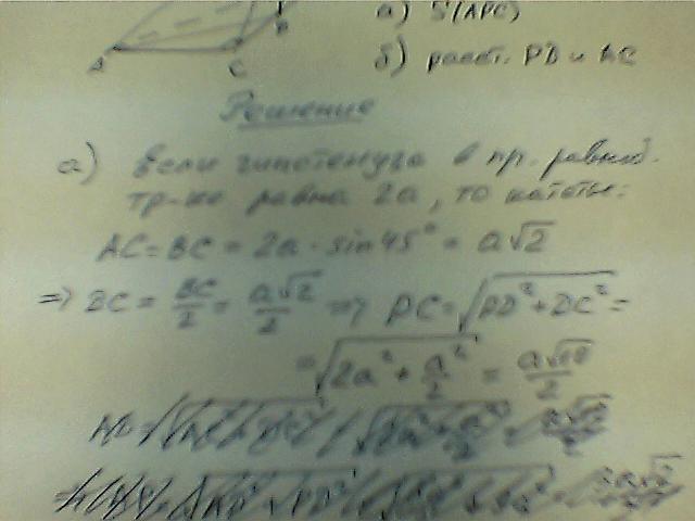 а корень из 2.Гипотенуза треугольника равна 2а.Найдите а) площадь треугольника РСА, б)расстояние между прямыми ВД и АС.