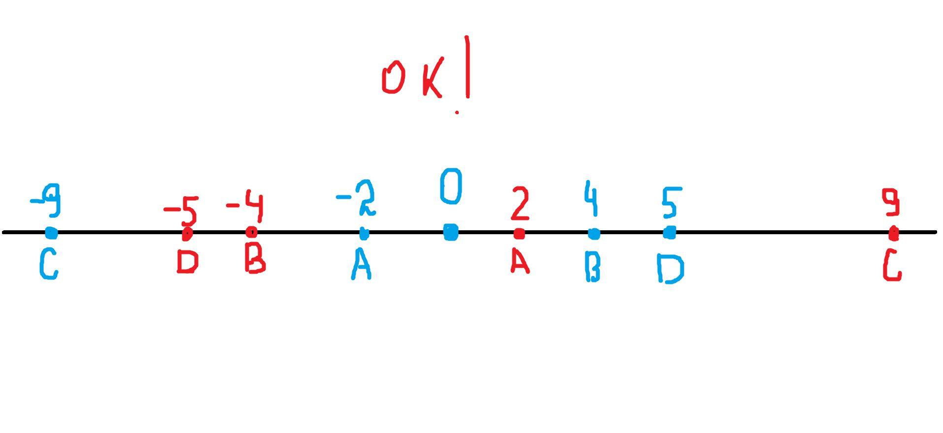 указать на коорд.прямой точки A(-2); B(4); C (-9); D (5) Написать противоположные им числа.