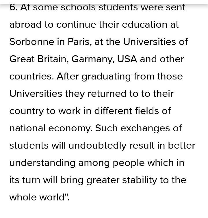 6. At some schools the leavers are sent abroad to continue their education at Sorbonne in Paris, at the Universities of Great Britain, Germany, USA and other countries.