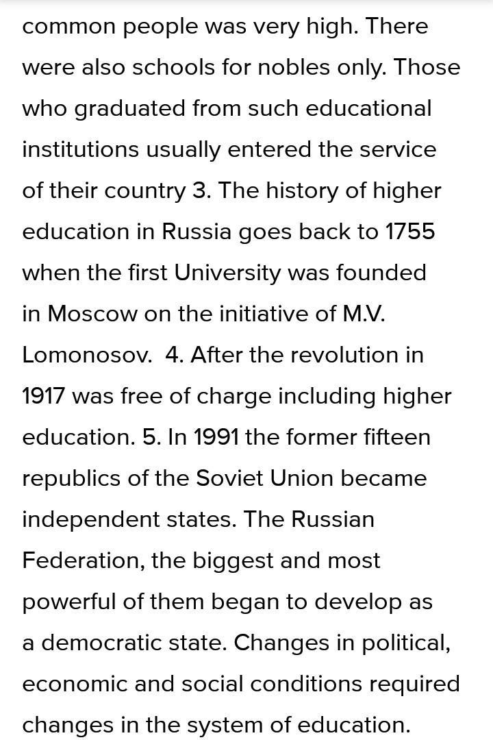 3. The history of higher education in Russia goes back to 1755 when the first University was founded in Moscow on the initiative of M.V. Lomonosov and in accordance with his plan. Later, universities were opened in many other big cities of the country.