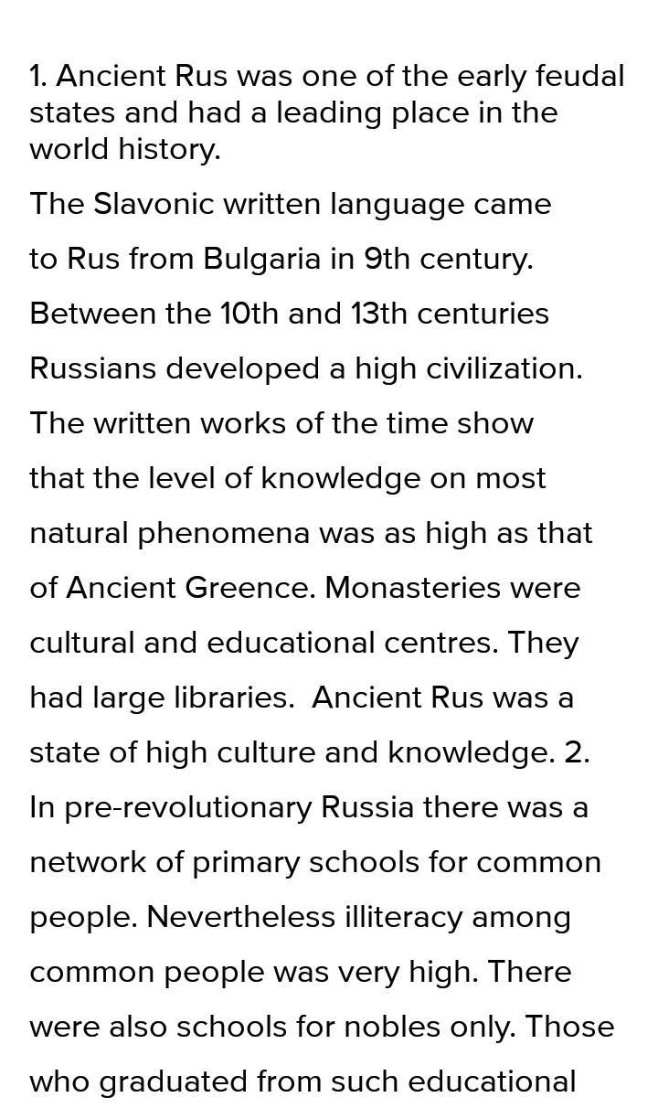 2. In pre-revolutionary Russia there was a network of primary schools for common people. Nevertheless illiteracy among common people was very high. Well-off people taught their children in grammar schools,1 commercial schools or secondary schools teaching no classics.2