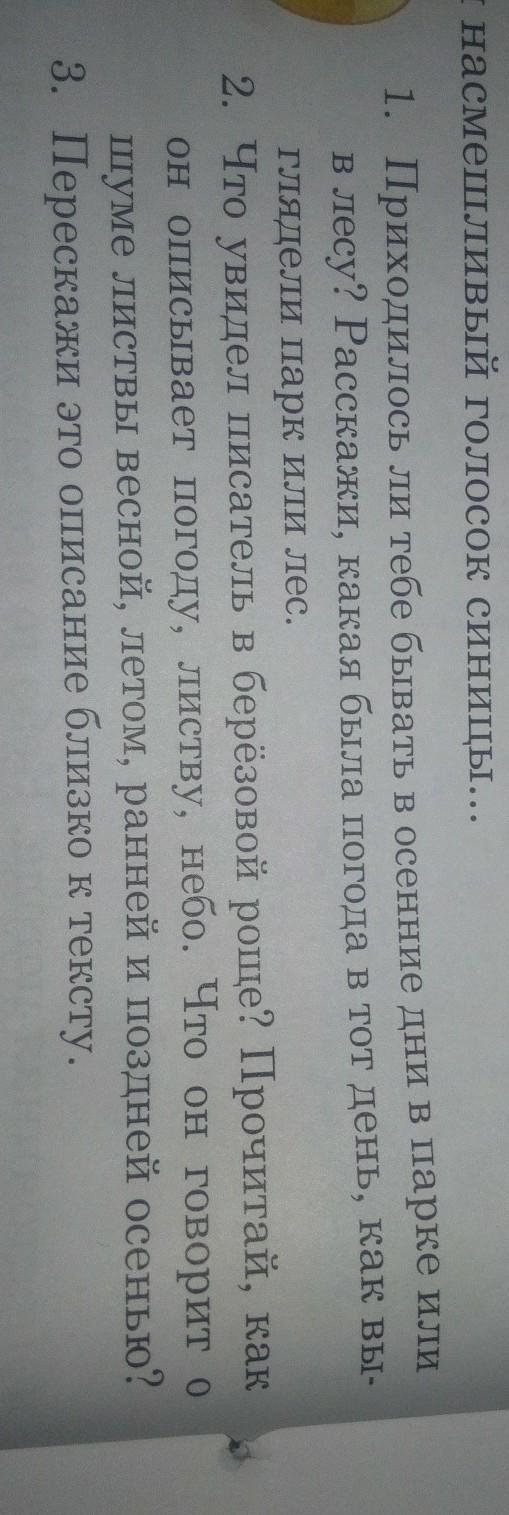 В осении дни когда я был в лесу был осенний дождь.Я видел птиц которые летали над лесом.Я видел падающие листья деревьев. Кстате что там остальные вопросы непонятные.Вот 2 вопрос нужен текст мне который ты читал скинь мне