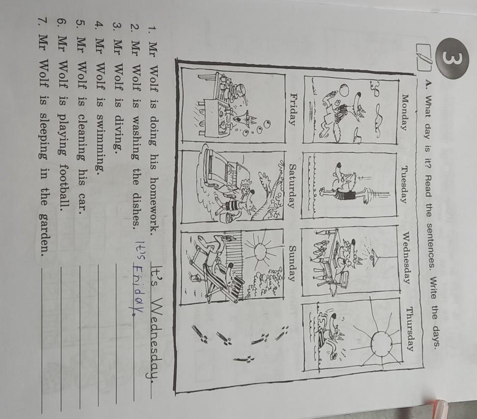 1. Mr Wolf is doing his homework. It's Wednesday.