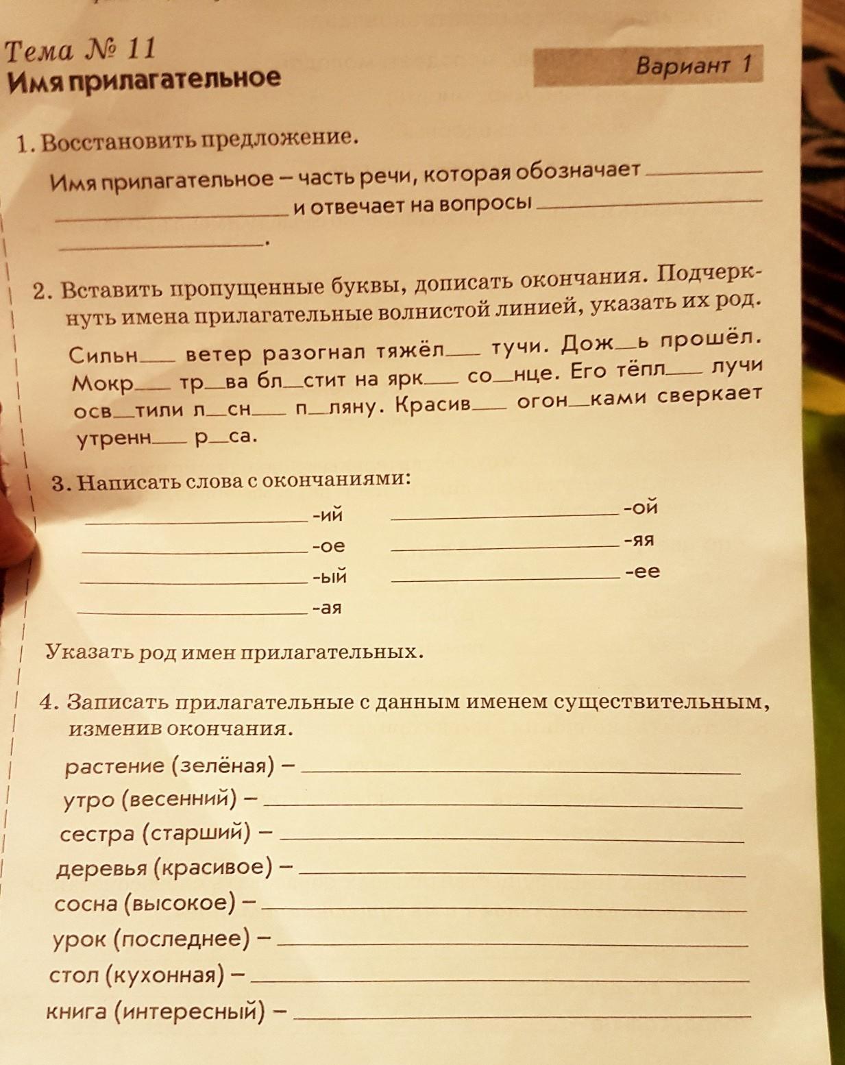 4) Растение зелёное,утро весеннее,сестра старшая,деревья красивые,сосна высокая,урок последний,стол кухонный,книга интересная.