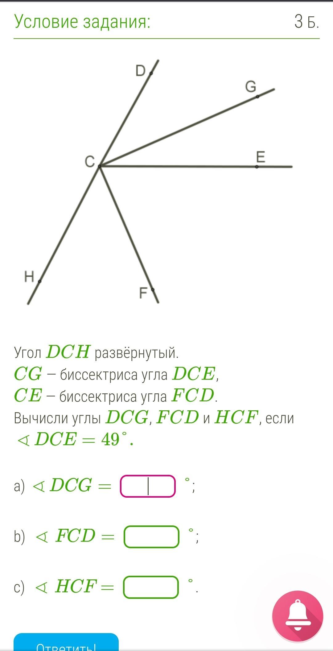 Вычисли углы DCG, FCD и HCF, если ∢DCE=49°.