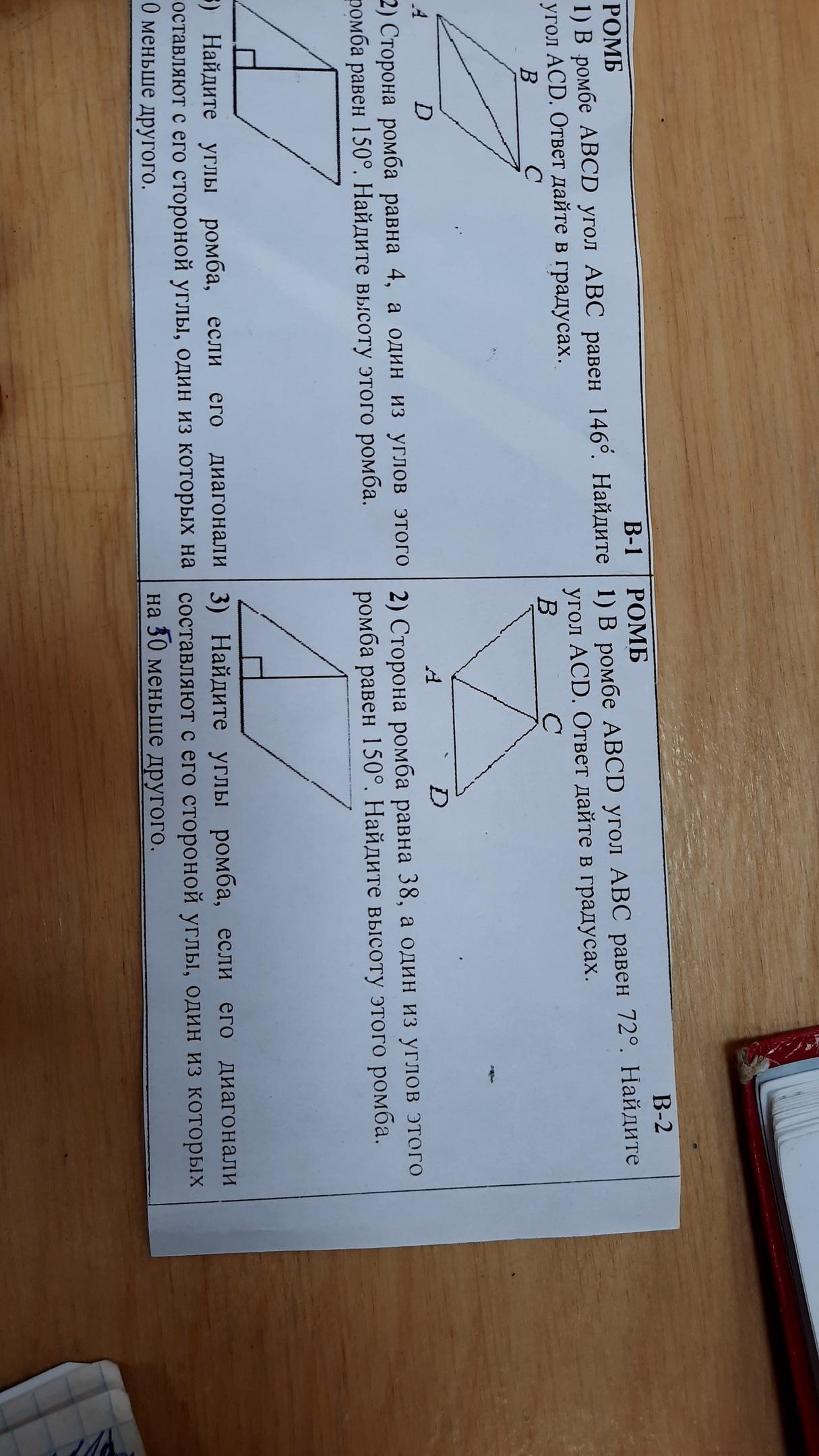 2) 180 - 150 = 30° это острый угол ромба Высота ромба образует прямоугольный треугольник, где сторона ромба является гипотенузой .А сама высота является катетом ,лежащим против угла в 30°,.а сторона лежащая против угла 30 ° равна половине гипотенузы