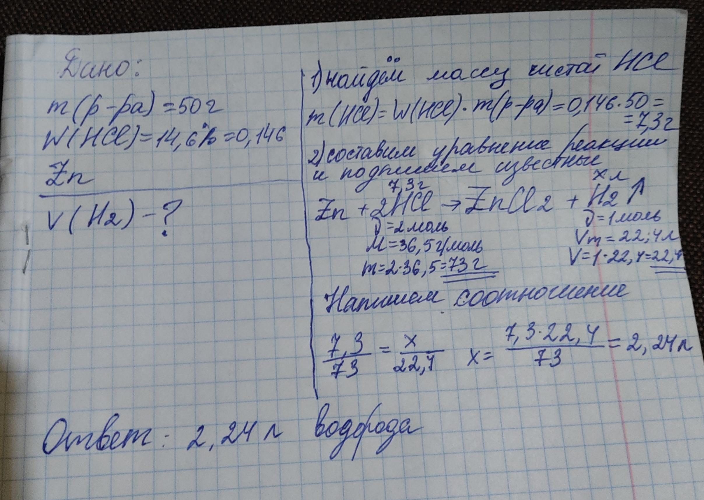 Какой объем водорода (при н.у.) образуется при взаимодействии цинка и 50 г 14,6% раствора соляной кислоты?