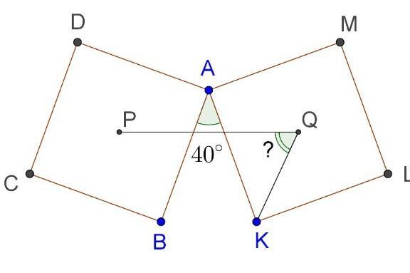 Квадрат AKML получен поворотом квадрата ABCD вокруг точки A на угол 130 против часовой стрелки. Р - центр квадрата ABCD. Q- квадрата AKML. найдите угол PQK.