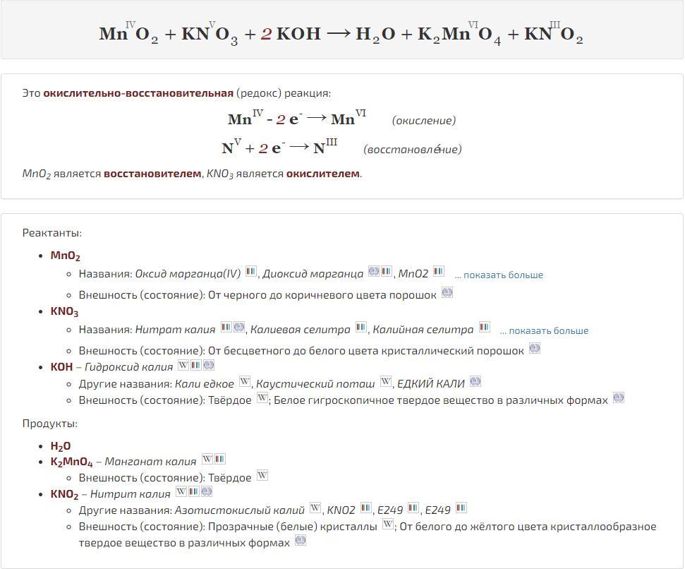 MnO2 + KNO3 + 2 KOH → H2O + K2MnO4 + KNO2