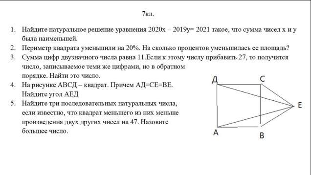 Так как СЕ=ВЕ=АД и АВСД - квадрат, то ВС так же равно СЕ и ВЕ. Следовательно, СВЕ - равносторонний треугольник, углы которого равны 60°. Угол ДСЕ=60+90=150°.