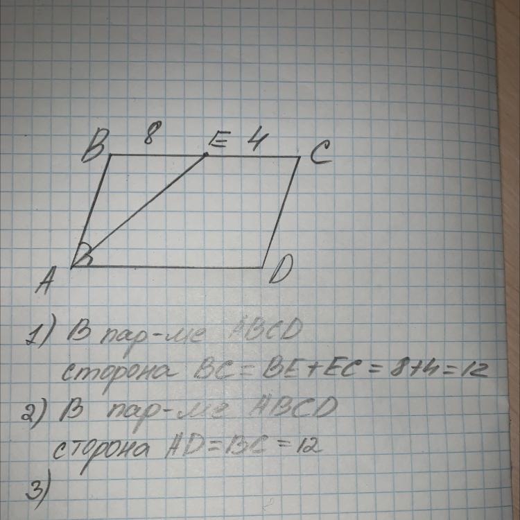 3)Поскольку ABCD - параллелограмм, то его стороны взаимно параллельны, тогда биссектриса АE является секущей для АD | | ВС, тогда угол EAD =углу AEB (внутренние накрест лежащие), тогда угол EAD =углу AEB = углу BAE, поскольку АE- биссектриса, тогда треугольник АВС равнобедренный, тогда АВ=ВE=8