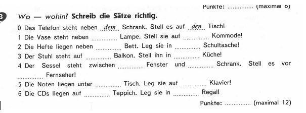 1. Die Vase steht neben der Lampe. Stell sie auf die Kommode.