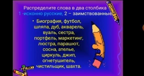 Помогите пожалуйста сделайте всё . Заполняем по столбикам 1- исконно русские.2-заимственные. По словам.